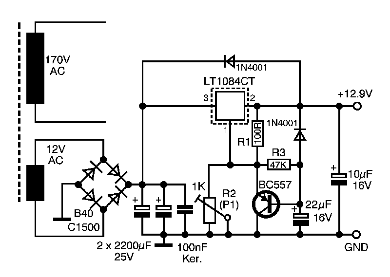 Diese obenstehende Schaltung ist die technische Grundlage. Es kommt ein zweiter Gleichrichter zur Anwendung, gekoppelt mit einem meiner Lieblings-ICs, dem LT1084. An dieser Stelle kann man natürlich auch den weithin bekannteren und verbreiteteren LM317 einsetzen. Nur sollte der entnommene Strom dann 1.3 Ampere nicht überschreiten, weil das LM317 eine interne Begrenzung auf 1.5A hat. Das LT1084 kann immerhin bis zu 5 Ampere liefern.